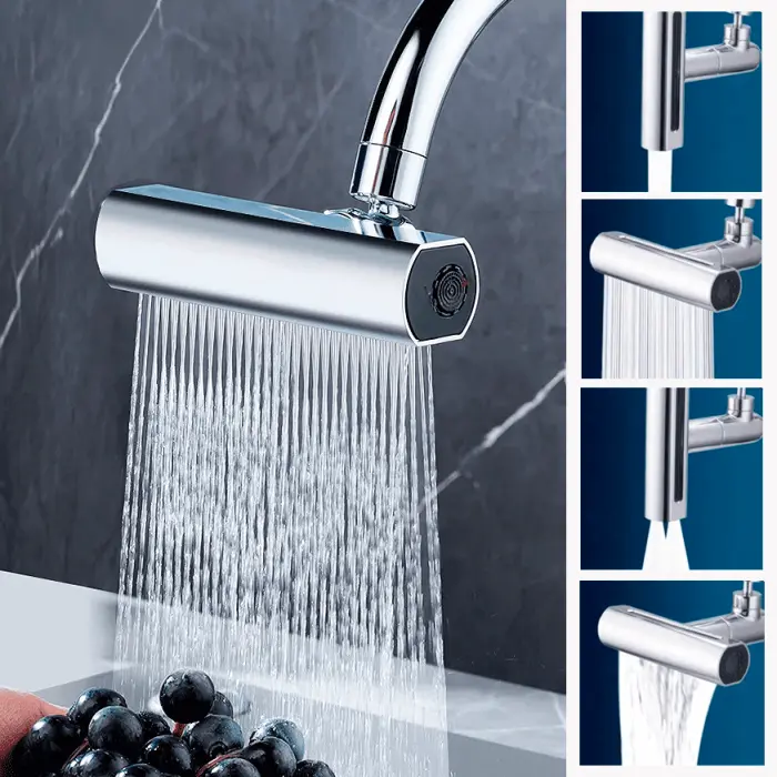 Adaptador de canilla 4 modos de salida de aguaCascada, flujo suave, pulverización y chorroCaño giratorio de 360°Fácil instalación: Incluye todos los accesorios necesarios para una instalación rápida y sencilla.