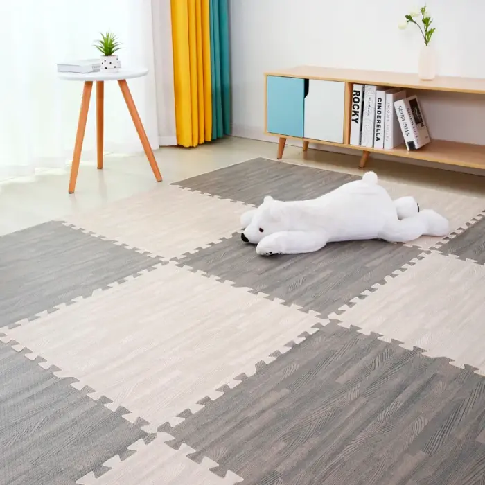 Placa piso de goma símil maderaMedidas: 60 x 60 cmMaterial: EVAColor gris y crudo. Se envía surtido.Incluye bordesPACK X4